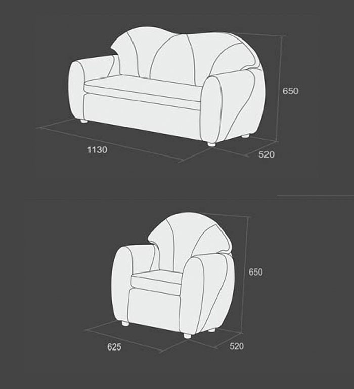 Габаритні розміри: диван - 1130х520х650 мм.; крісло - 625х520х650 мм.