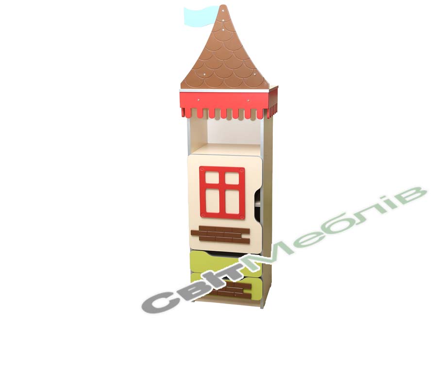 Матеріал: Корпус,полиці, дверці: ДСП ламінована, товщина 16 мм. Задня стінка: ДВП ламінована біла 3 мм. фасад оклеєний крайковою стрічкою ПВХ - 1 мм. інші частини ПВХ - 0,5 мм. з оздобленням МДФ 10мм., фарбованого в коричневий, червоний, зелений, блакитний та чорний кольори.