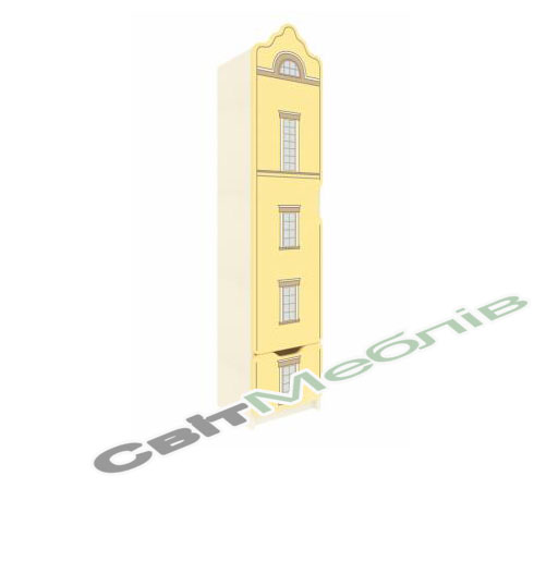 Корпус стінки, полиці, шухляда та дверцята виготовляються з ламінованої ДСП товщиною 16 мм. Фасад оклеюється крайковою стрічкою ПВХ товщиною 1 мм, інші частини оклеюються крайковою стрічкою ПВХ товщиною 0,5 мм. Задня стінка виготовляється з білої односторонньої ХДФ товщиною 2,5 мм. Шафа має 5 закритих полиць та шухляду на напрямних повного висуву. Фотодрук здійснюється на плиті ДСП із застосуванням спеціальних чорнил, які затвердівають під дією випромінювання спеціальних ультрафіолетових ламп. Також застосовується технологія покриття лаком самого малюнку для збільшення стійкості до зовнішніх пошкоджень, стирання та вологого прибирання. Фурнітура: мініфікси, єврогвинти, напрямні кулькові повного висуву.