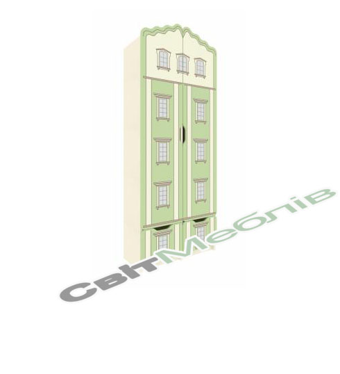 Корпус стінки, полиці, шухляди та дверцята виготовляються з ламінованої ДСП товщиною 16 мм. Фасад оклеюється крайковою стрічкою ПВХ товщиною 1 мм, інші частини оклеюються крайковою стрічкою ПВХ товщиною 0,5 мм. Задня стінка виготовляється з білої односторонньої ХДФ товщиною 2,5 мм. Шафа розділена на дві частини: відділення для верхнього одягу з гачками та відділення з полицями. Також шафа має дві шухляди на напрямних повного видвигу. Фотодрук здійснюється на плиті ДСП із застосуванням спеціальних чорнил, які затвердівають під дією випромінювання спеціальних ультрафіолетових ламп. Також застосовується технологія покриття лаком самого малюнку для збільшення стійкості до зовнішніх пошкоджень, стирання та вологого прибирання. Фурнітура: мініфікси, єврогвинти, напрямні кулькові повного висуву, гачки хромові малі.