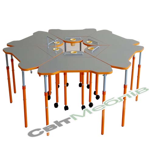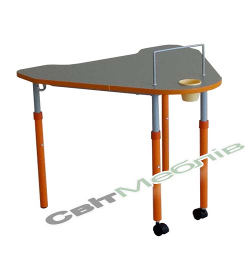 Каркас стола виконаний з труб 25х25х1,2; Ø 27х1,2 та Ø 32х1,2 для зростових груп 3-5.. Стіл має 4 ноги-опори – дві передні оснащені роликами, за допомогою яких стіл може легко переміщатися по приміщенню. Регулювання стола по висоті здійснюється за допомогою гвинтових стяжок та рухомих, по відношенню одна до одної, деталей каркасу. Рухомі деталі каркасу з’єднані через пластикову втулку.
